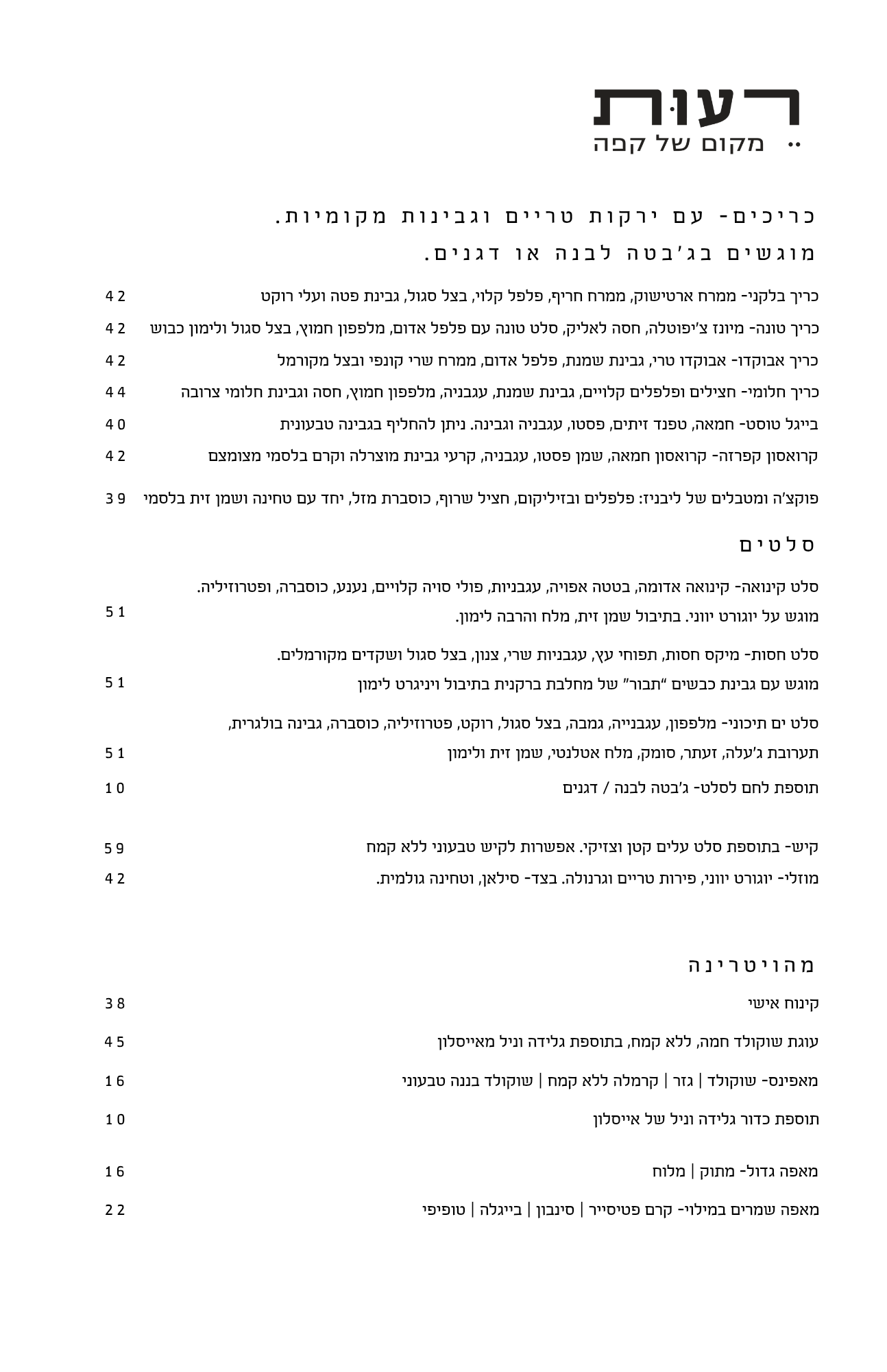 בין גפנים, עצי זית ושקדים, שוכן הבית שלנו לקליית הקפה ולבר הקפה- רעות. המקום כשר (חלבי) ונמצא בלב מתחם יפהפה בכפר תבור. לצד הקפה אנו מגישים תפריט אוכל קל לישיבה או טייק אווי: